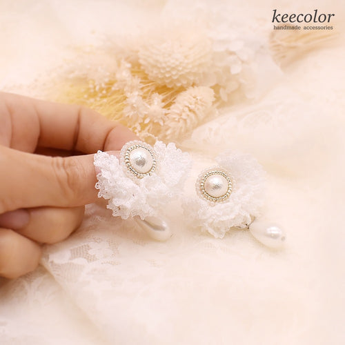 2WAY 手編みレースのふんわりイヤリング ウェディング フォーマル タティングレース糸 コットンパール